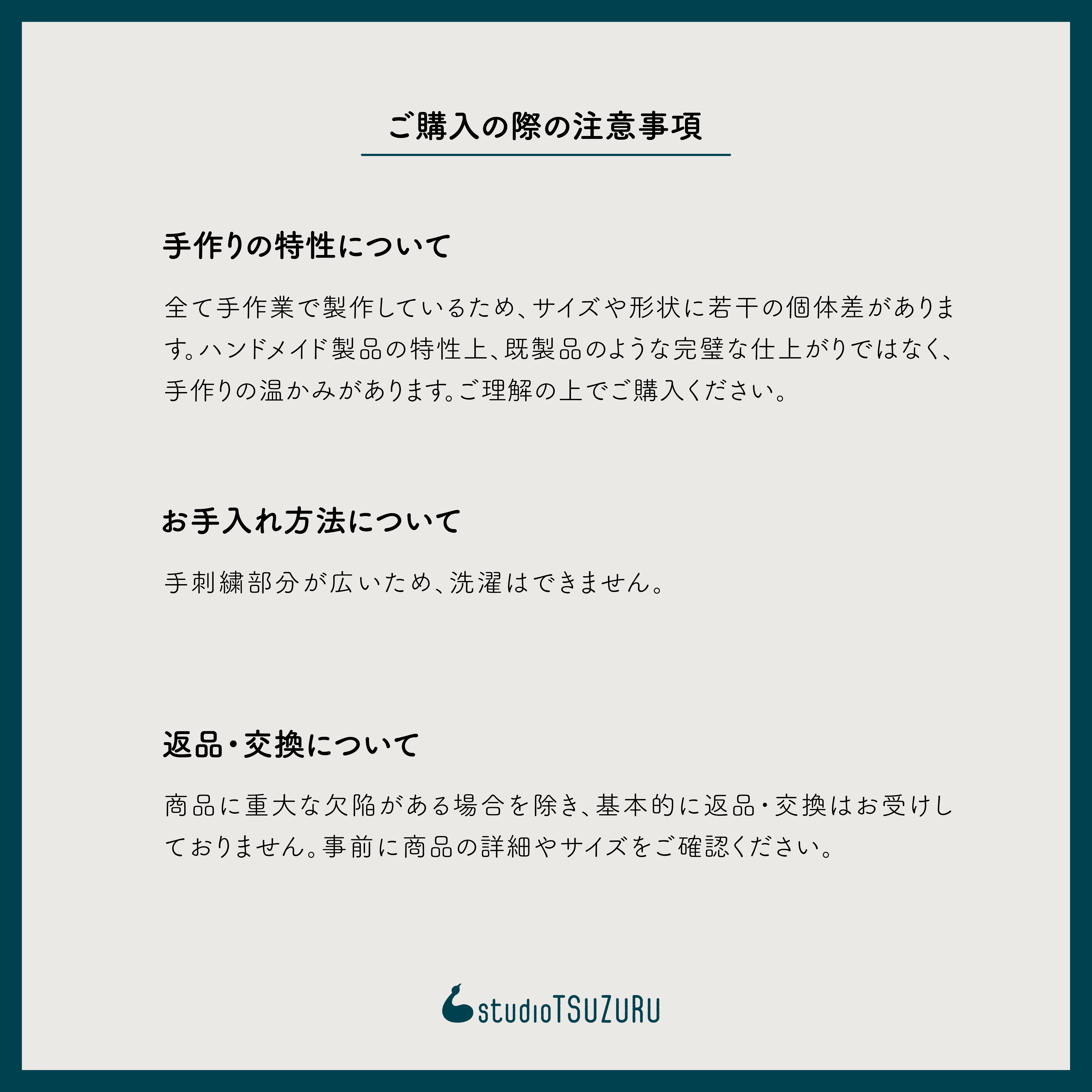 手刺繍の特性をご理解のうえ、お買い求めいただきますよう、お願いいたします。