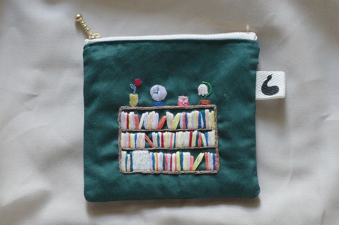 本棚に並ぶたくさんの本をカラフルに刺繍しました。